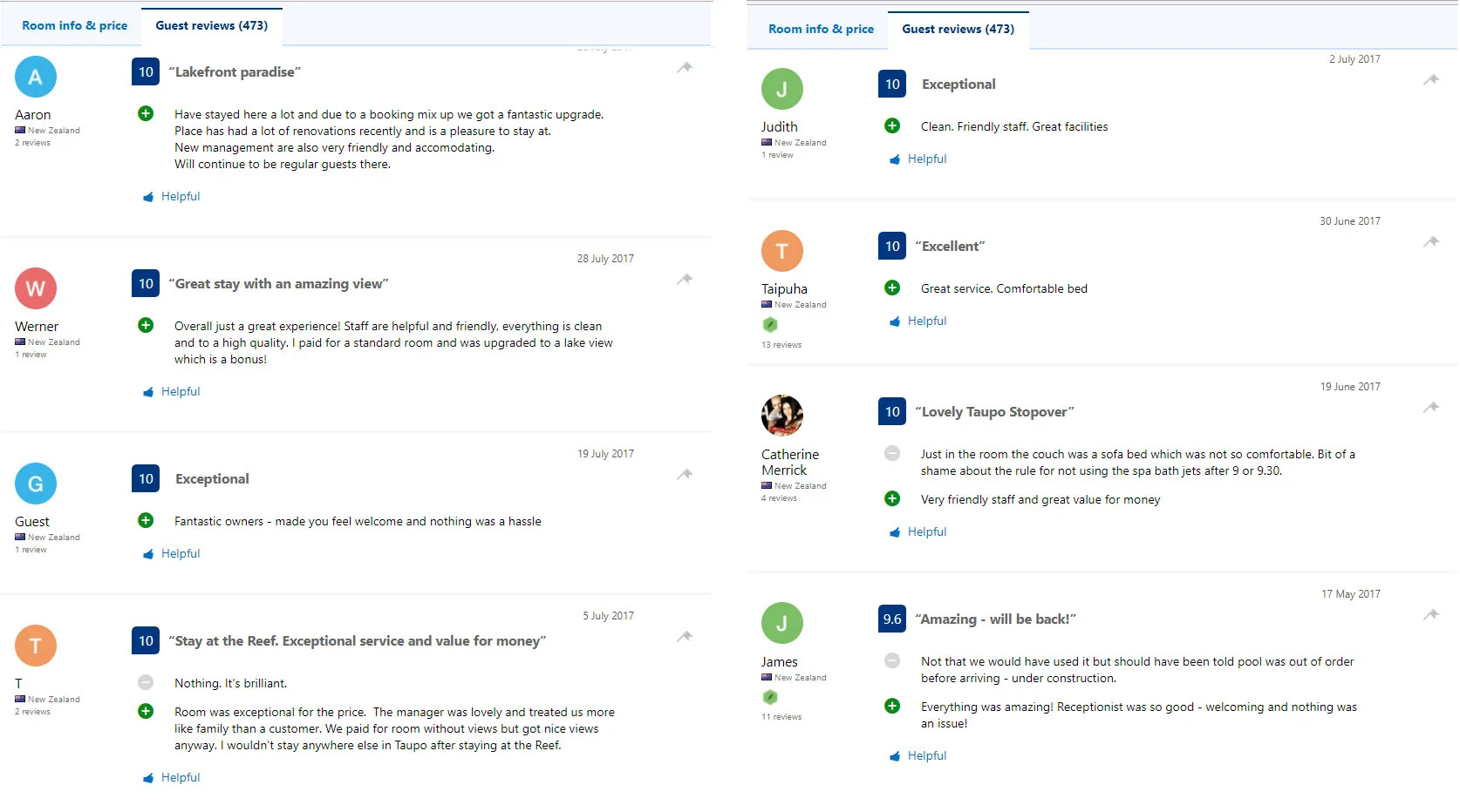 Accordingly, I usually ignore the high scoring hotels with very few reviews. What constitutes "very few reviews" depends on the nature of the location. In bigger/more popular cities like Auckland or Queenstown, there'll tend to be more user reviews, so we'll ignore accommodation with less than 50 reviews, and usually look at hotels with 150 reviews or more. In smaller or less popular locations, even 20 reviews might be sufficient.